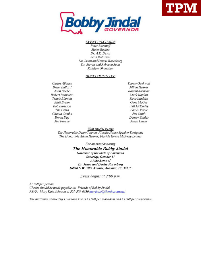 12.20.09 Gov. Bobby Jindal looking to bag contributions, ducks - hosted by Scott Angelle - asking $5,000 per person for the event
