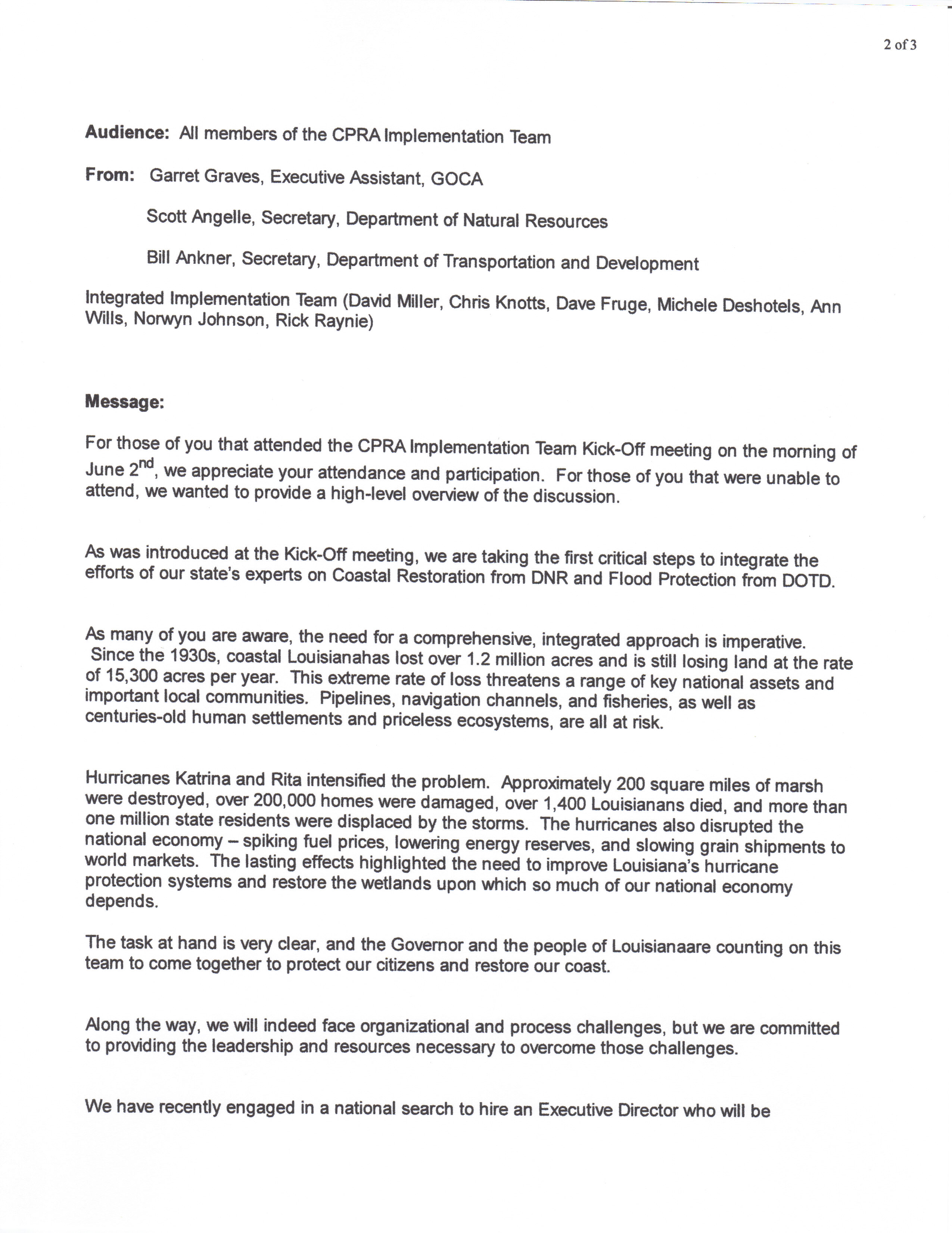 6.24.08 Starting July 1, staff will work together under the umbrella of the state’s Coastal Protection and Restoration Authority and the Governor’s Office of Coastal Activities